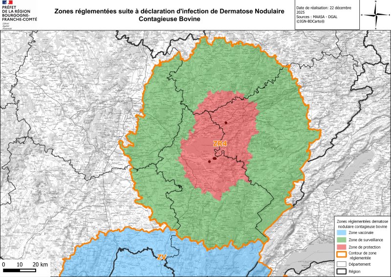 Un premier foyer de dermatose nodulaire contagieuse bovine (DNC) a été confirmé dans le Jura, le 11 octobre. Ce foyer a conduit à délimiter une zone réglementée dite ZR 4 concernant une partie des départements de Côte d’Or, du Doubs, du Jura,de la Haute-Saône, de Saône et Loire. Dans cette zone, 4 élevages du Jura ont été infectés. Cette zone est étendue à compter du 29/11/2025, à la suite de la confirmation d’un foyer dans le Doubs.