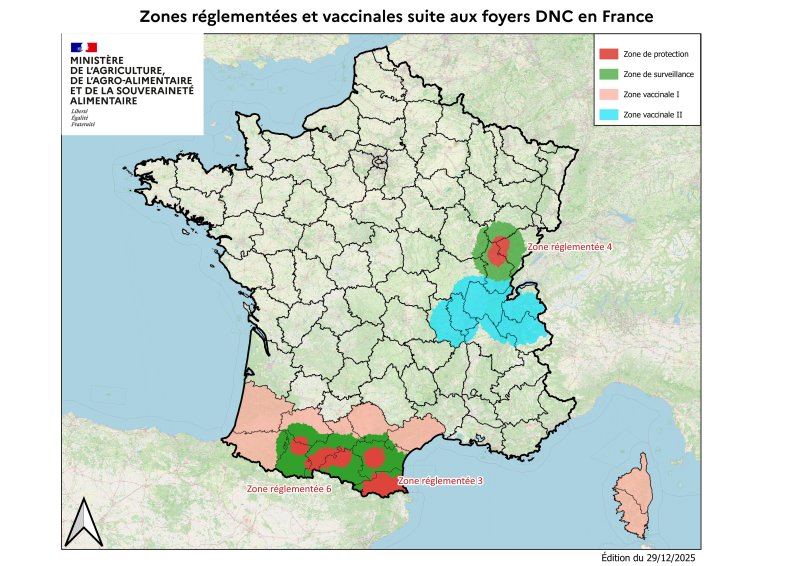 Depuis le 15 octobre 2025, un troisième foyer confirmé dans le département de l’Ain impacte des communes de l’Ain, Isère, Jura, Loire, Rhône et Saône-et-Loire et entraîne la création d’une zone réglementée dite ZR 5. Le 30 novembre, ces mesures ont été allégées, avec le passage de cette zone en Zone Vaccinale (ZV5).