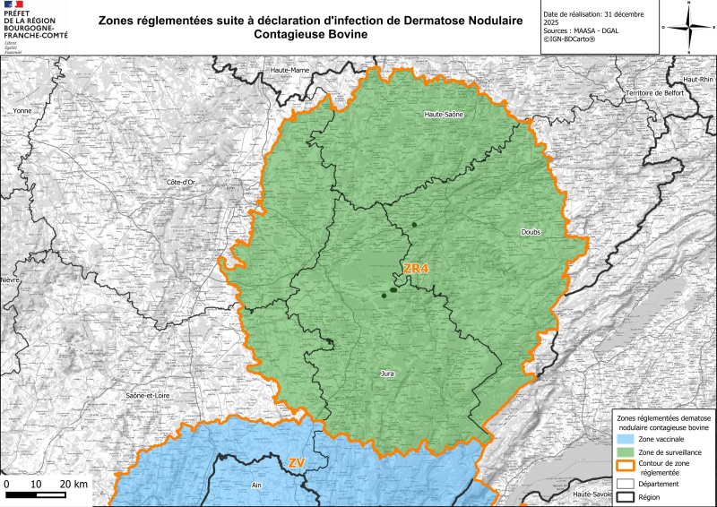 Un premier foyer de dermatose nodulaire contagieuse bovine (DNC) a été confirmé dans le Jura, le 11 octobre. Ce foyer a conduit à délimiter une zone réglementée dite ZR 4 concernant une partie des départements de Côte d’Or, du Doubs, du Jura,de la Haute-Saône, de Saône et Loire. Dans cette zone, 4 élevages du Jura ont été infectés. Cette zone est étendue à compter du 29/11/2025, à la suite de la confirmation d’un foyer dans le Doubs. Au 31/12/2025, 28 jours après le dernier foyer, la zone de protection devient zone de surveillance.