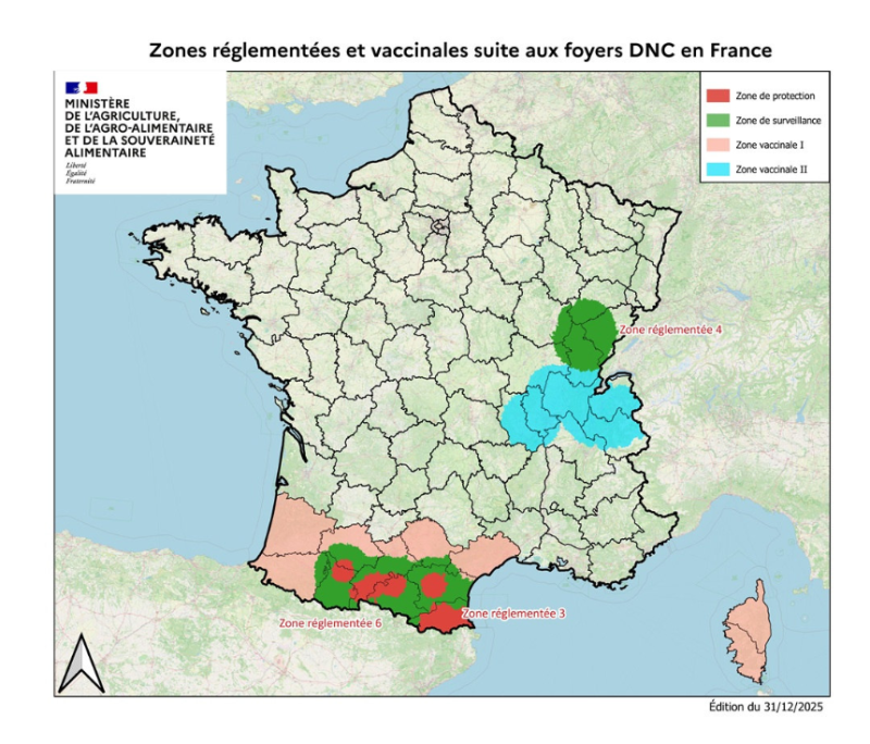 Puis, le 15 octobre 2025, un troisième foyer confirmé dans le département de l’Ain impactait des communes de l’Ain, Isère, Jura, Loire, Rhône et Saône-et-Loire et entraînait la création d’une zone réglementée dite ZR 5. Le 30 novembre, ces mesures ont été allégées, avec le passage de cette zone en Zone Vaccinale (ZV).