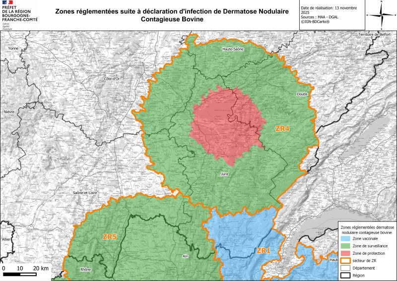 Depuis le 08 septembre 2025, la zone réglementée, dite ZR 1 définie autour du foyer de l’Ain , impacte en Bourgogne-Franche-Comté des communes du JURA. Le 22 octobre , des mesures ont été allégées, avec le passage de cette zone en Zone vaccinale (ZV)